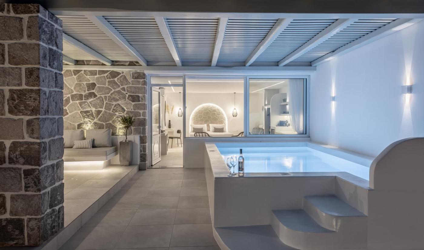 Junior Suite with Private Pool. Guests will have a special experience as this suite offers a pool with a view and a hot tub. Boasting a private entrance, this air-conditioned suite includes 1 living room, 1 separate bedroom and 1 bathroom with a bath and a shower. The unit has a tea and coffee maker, sea views, a terrace and winechampagne is offered for guests. The unit has 1 bed.